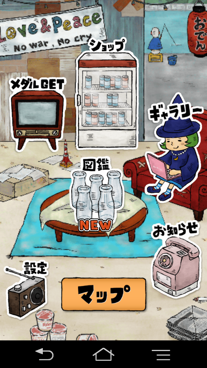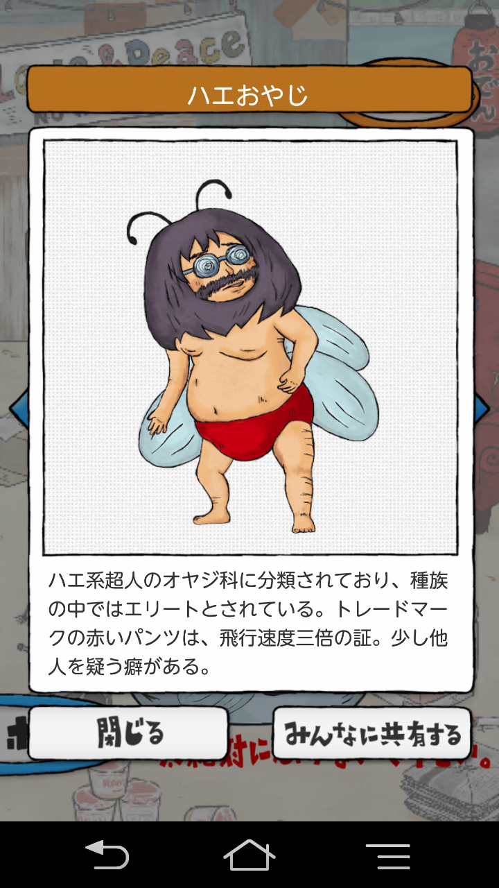 公式サイトAndroid版ダウンロードページiPhone版ダウンロードページ 正直タイトルからしてよく意味がわかりません。ヒーローなのでしょうか? 『ひとり戦隊』の5文字で既に矛盾しているし。 ……開始画面からしてよくわかりません。しょぼくれたおっさんが変な格好をしてニヤけています。周りにいるのも同じく変なおっさんが中心ですね。 そういえばマナーモードにしていたので、解除してみます。 あれ? なんだかカッコイイギターの演奏が流れてきました。これは結構テンションが上がります! 『おっさんマ~ンおっさんマン♪』