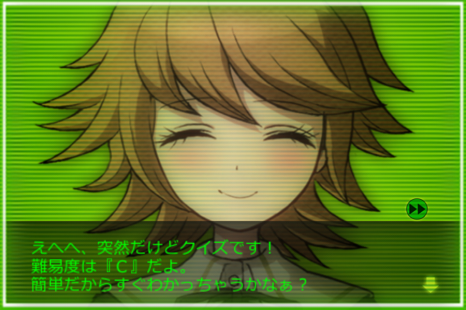 すでに萌えます。 これは期待大です。 ♪アルターエゴとの内容豊富なフリートーク! ダンガンロンパキャラクターの話をしてくれたり、個人的にお話してくれたりします。 キャラクターの話では、キャラ毎に好感度の上がるプレゼントの紹介もしてくれるので、本編プレイ時参考にできます! ゲームに関するクイズを出してくれたりも。