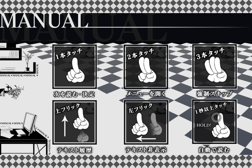 どこにでもふらりと現れる奇妙な青年。 主人公に謎の警告を残しては立ち去っていくが、真意や目的は謎に包まれている。 ♪簡単操作と、豊富な遊べる選択肢! ノベルゲームは捜査が面倒な時や、テキストを読み飛ばしたくてもうまく読み飛ばせないことが多々あります。 が、このゲームは本当に簡単捜査! 普通にタップすると決定や次のページ送り、2本タッチでメニューをひらき、3本タッチで強制スキップ…と、アクションが割り当てられているので、ストレスなく読み進められます!