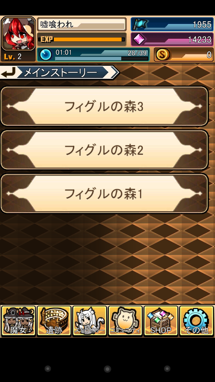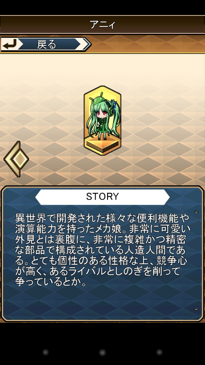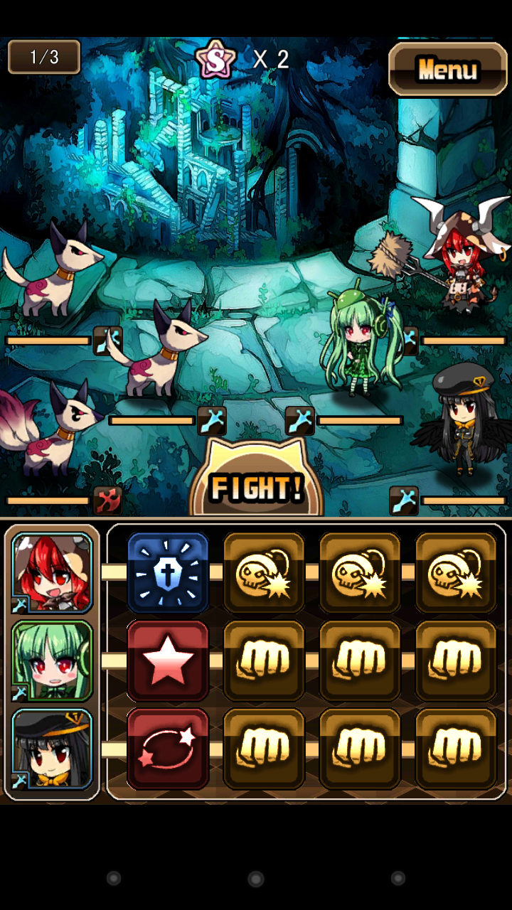 Screenshot_2014-03-27-11-42-28 基本的には、下部にある『遺跡』というアイコンから戦いの場に挑むことになります。 Screenshot_2014-03-27-16-37-13 Screenshot_2014-03-27-16-37-30 Screenshot_2014-03-27-17-15-44 1つのエリアの中に7つほどのステージがあり、それらを全てクリアすれば無事、そのエリアはクリアです! ステージのクリア状況に応じて、そこにまつわるストーリーが開放されていき、『ストーリー』を選択することで何度でも確認することができるので、どういう物語なのかを常に把握することが可能になっています。 Screenshot_2014-03-27-20-49-29 Screenshot_2014-03-27-20-18-58 Screenshot_2014-03-27-20-19-08 そして最大のポイントがやはり戦闘です。 個性的で魅力的なSDキャラが、縦横無尽に画面内を駆けまわり、様々なパターンのアクションを見せてくれるので、見ているだけで幸せになってしまいます。 よくもまあスマートフォンの画面でこれほどまでに動くものだと感心してしまいました。 Screenshot_2014-03-27-16-26-45 アクションやエフェクトは凝っている一方、操作性は至ってシンプル。 キャラクターごとに用意されているコマンドの順番と、3人の味方を配置するポジションを決めたら後は中央のFIGHTボタンを押せば、4ターンの間自動的に動きまわってくれます。 基本的にこういうゲームは初心者にとって一番の難関になるのが戦闘時の操作だと思いますが、その不安を排除してくれているのはとてもありがたいですね! シンプルながらも多数の技や、武器の相性などもあるので、慣れている方も飽きさせないような作りになっていると思います